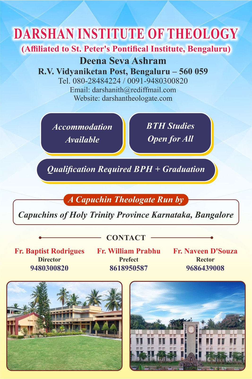 The Institute of Theology is affiliated to the Sacred Congregation for Catholic Education, Rome and to St. Peter's Pontifical Institute, Bangalore. Students receive the Bachelor's Degree in Theology (B.Th.) after completing their theological studies. Students from Capuchin jurisdictions and other Religious Orders such as OSB, Rosminians and Heralds of the Good News also study here. Darshan Institute of Theology has further furnished itself with all the proper academic facilities and technical audio-visual equipment to function principally as the Institute for the Religious and Theological formation of the Capuchin Friars of the Holy Trinity Province that is spread over the six States of India, viz. Karnataka, Madhya Pradesh, Mizoram, Tripura, Nagaland and Mizoram. It has also now brought up-to-date its Statutes in line with the recent Apostolic Constitution Veritatis Gaudium (2017) and the Norms of Application (2017) and Norms for Affiliation (2020) issued by the Congregation for Catholic Education regarding ecclesiastical Universities and Faculties. It is done with the aim of continuing to attain via St. Peter’s Pontifical Institute to which it is affiliated, the academic degree of the basic first cycle of Theology, i.e. baccalaureate. Hence, special attention is paid to the requisite norms that pertain to the affiliated Institutes of Theology (VG 63.1). Other than St. Peter’s Pontifical Institute of Theology in Bangalore,