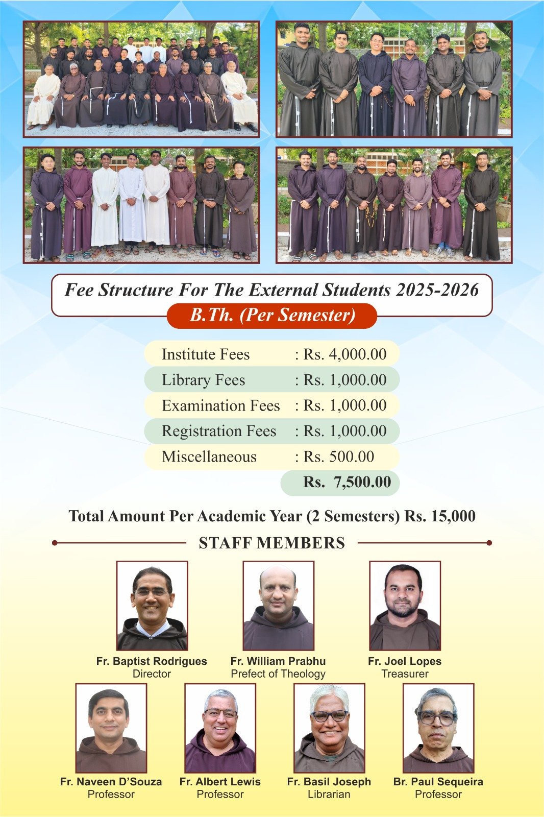 After completing the six semesters of theological studies, the institute conducts a Pastoral Year Programme lasting one full academic year. This period enables students to integrate their theological learning with practical pastoral ministry.